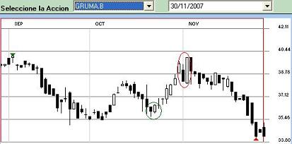 ![]() La gráfica de velas japonesas muestra una pauta envolvente alcista en Gruma.B (Primer círculo verde). Además, la vela negra involucrada es un martillo, lo que nos da mayor seguridad en el patrón. Como se puede ver en el círculo rojo, cuando el engulfing bullish se presenta en la parte alta de una alza, puede significar lo contrario: Se avecina un cambio de tendencia hacia la baja,