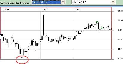 | Es una formación con una sola vela, en la cual se tiene un pequeño cuerpo (no importe el color). La sombra inferior es larga, y la superior es inexistente o casi inadvertible (Cierre casi igual al máximo)