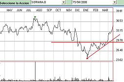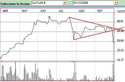 ![]() Gráfica de AUTLAN B con rompimiento de tríangulo en septimbre del 2008. Tríangulo ascendente Un triángulo ascendente ocurre cuando hay valles ascendentes (como en el triángulo simétrico), pero los picos se presentan al mismo nivel de precios debido a la resistencia. En la mayoría de los casos hay un rompimiento hacia arriba en un triángulo ascendente.