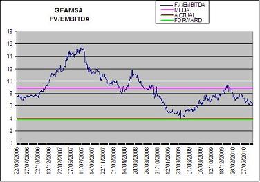Si la tasa de interés de los Bonos del Tesoro a 10 años sube, o el Riesgo País sube, el múltiplo se encarece. Si bajan, el múltiplo se abarata. El siguiente ejemplo muestra como en GFAMSA.A, a pesar de que el múltiplo FV/EBITDA no había tocado mínimos anteriores, su múltiplo FV/EMBITDA si lo estaba haciendo, marcando el momento de entrar en la valuación más baratas.