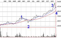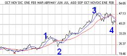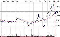 - Seis meses después, la onda 3, mucho más larga que la 1, parece terminar, dando señal de salida. Venta para ver a donde nos lleva la onda 4, comprando cerca de la cresta 1 si es posible.