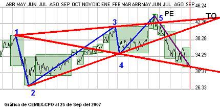 Ejemplo de una Onda de Wolf en CEMEX.CPO. Aparentemente se llegó antes a la linea 1-4 (POE), y la utilidad para quien se haya puesto en corto es de un 29%.