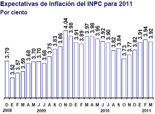 InflaciónLos especialistas consultados proyectan que la inflación general, medida a través del INPC, para el 2011 será del 3.92%. Para el 2012, este mismo conceptos se considera que se situará en 3.84%