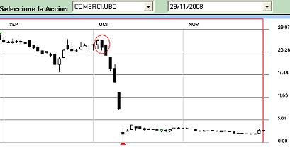 ![]() La gráfica de velas japonesas muestra una pauta envolvente bajista que previene de la debacle de comerci.ubc en octubre del 2008.