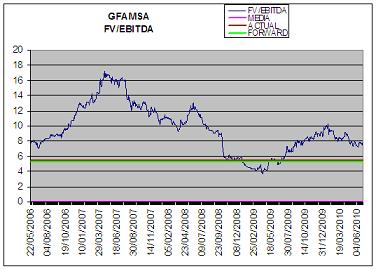 Si la tasa de interés de los Bonos del Tesoro a 10 años sube, o el Riesgo País sube, el múltiplo se encarece. Si bajan, el múltiplo se abarata. El siguiente ejemplo muestra como en GFAMSA.A, a pesar de que el múltiplo FV/EBITDA no había tocado mínimos anteriores, su múltiplo FV/EMBITDA si lo estaba haciendo, marcando el momento de entrar en la valuación más baratas.
