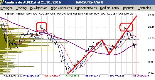![]() Para ellos, el valor de la bolsa Mexicana ha bajado un 36% ¿Invertirían ustedes en un mercado tan bajista? Por eso es que los valores de las acciones mexicanas se han visto tan presionadas con volúmenes de venta muy fuertes. El analizar las gráficas de nuestras emisoras con una visión en dólares, también nos ayuda a encontrar puntos de entrada y salida que no se ven cuando las manejamos en pesos. En el siguiente ejemplo está una gráfica de Alpek.