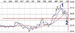 - Un mes despues (21 junio 2006), el precio cruza su pm de 21 días. En esta gráfica hay que notar algo muy importente. El precio estuvo por abajo de la cresta que suponiamos era nuestra onda 1, pero la teoria de Elliot establece que la onda 4 no puede ir por abajo del nivel de la onda1, por lo que nuestro conteo estaba incorrecto. En este momento podemos pensar que lo que creiamos un movimiento 3-4 pudiera ser un movimiento 1-2 de una onda más grande, por lo que estariamos entrando en una onda 3 mucho mayor. Vale la pena entrar, ya que conocemos el piso.