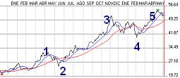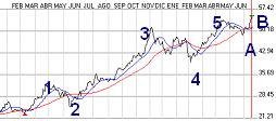 - Seis meses después, la onda 3, mucho más larga que la 1, parece terminar, dando señal de salida. Venta para ver a donde nos lleva la onda 4, comprando cerca de la cresta 1 si es posible.